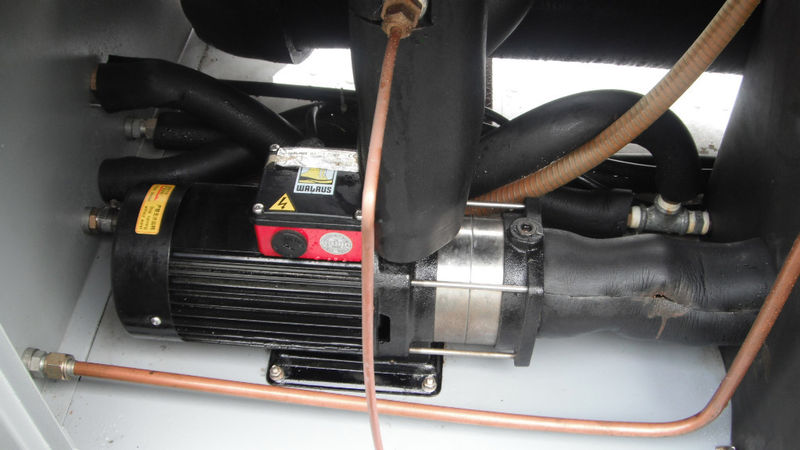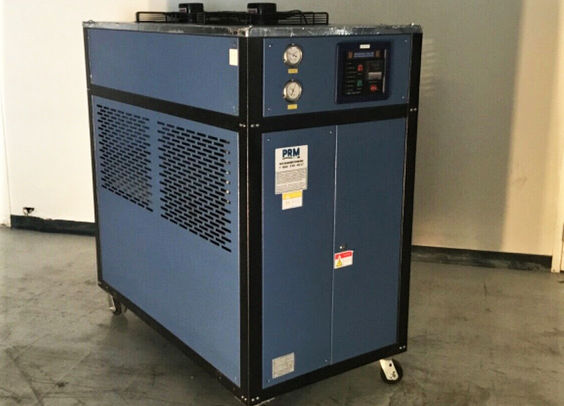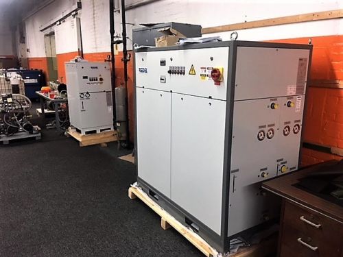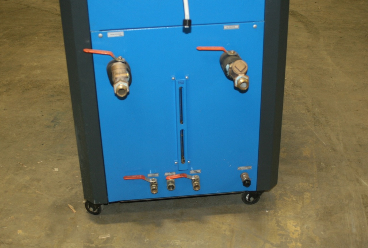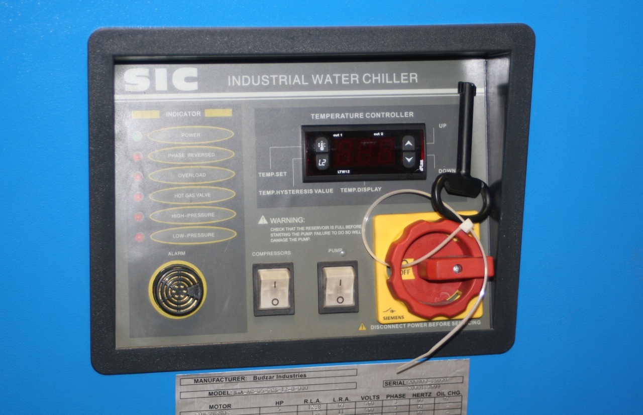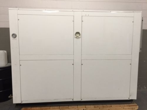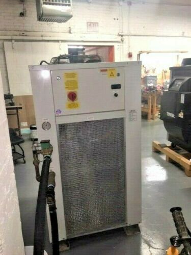 Arrived at KIG in November 2018. This never used dual-circuit 6 ton Riedel Chiller is WATER COOLED, not air cooled. Please let us know if you do not know the difference. A water cooled water chiller does not have fans, it uses a secondary water source (like a cooling tower) for the condenser cooling. This unit is 460 volt and originally designed to cool laser machines. It has 2 compressors, a primary tank and a secondary tank, and a primary pump and a smaller secondary pump. For a non laser application we will modify and disable the smaller pump and tank (we have done this often) and you will still get the full amount of 6 tons of cooling.