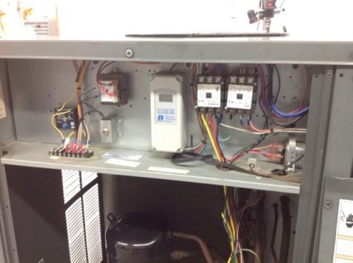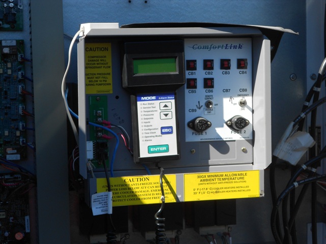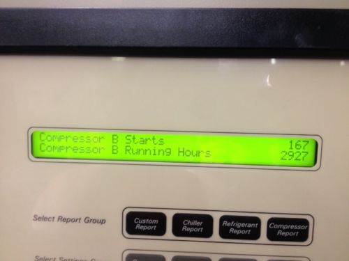 Arrived at KIG in October 2014 was this nice Trane RTAA 100 chiller. These units are known as workhorses in the industry, and this particular unit has the low ambient VFD fan drive option to operate in outdoor climate (cold or warm) year round. Additionally, this chiller has the factory low fluid temperature "brine" option to handle set point temperatures 0° to 39°F (but equally as fine for higher more common setpoints). Low hours (see below).