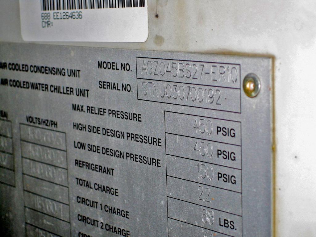 This is a super nice 2009 Trane CGAM series 90 ton Air Cooled Chiller. Low Voltage 208/230V. This unit features 4 Scroll compressor, and Low Ambient Option (actually it has what's called Super Wide Ambient capable of running when outdoor temperatures are from 0°F to 125°F). Unit uses the newer R410a refrigerant.
